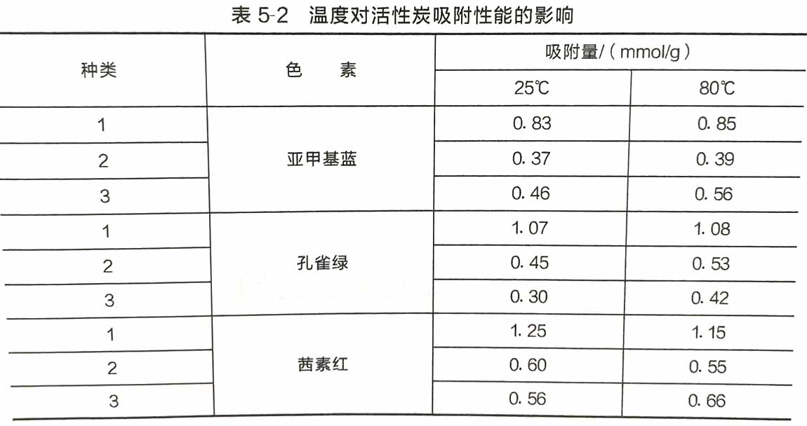 诸多研究表明,活性炭在液相中的吸附过程是放热的,降低温度有利于吸附性能的提高。但是,在液相中,升高温度可以有助干促进液相分子的活度和扩散,增强其在活性炭孔隙结构中的吸附。在实际应用过程中,温度的确定不仅考虑上述因素,还需要兼顾液体自身特性,比如黏度大的液体需要通过提高温度来增加其流动性,对于某些熔点高的物质也需要确保温度高于熔点,而热敏性差的物质就需要考虑温度对其有效成分的影响。总之,温度对于活性炭应用的影响,不仅需要考虑吸附性能也需要考虑应用状况·无法通过温度变化来提高其吸附量,也难以规定统一的操作温度,需要视情况而定,表5-2中的数据亦可资参考。三种色素的吸附量随温度变化的情况(时间为60min)。