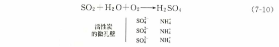 此外,还有离子交换吸附机理和电层吸附机理。离子交换吸附机理认为气相液滴中溶解了铵盐,如(NH4)2SO4,其中SO42-与活性炭作用时滞留在活性炭的微孔内壁的活性中心上,这种活性中心(称氧化性点)能释放出阴离子并与SO42-进行离子交换反应,从而使SO42-吸附在活性炭上。电层吸附机理认为:硫酸根离子与活性炭微孔壁上活化点吸附后,形成局部负电区,在静电作用下,气相液滴中的迁移离子如NH4+产生定向吸附,并与SO42-形成双电层,从而形双电层吸附。