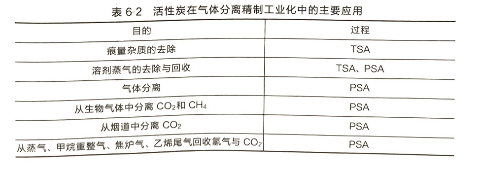 活性炭是一种新型材料,从工业化至今已经在工业中得到较为广泛的应用:有机废水处理、无机废水处理、有机溶剂回收、空气净化、水果保鲜以及气体分离等,这里就其在气体精制分离应用方面加以叙述。活性炭在气体分离精制中的主要应用,具体见表6-2。